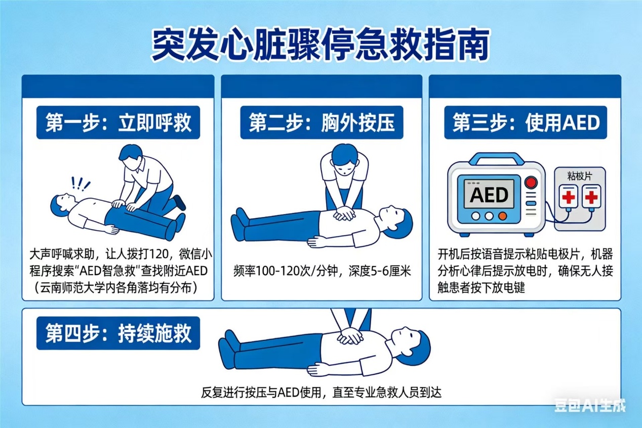 大声呼喊求助,让人拨打120,并尽快取来附近AED(云南师范大学自动体外除颤器分布在学校内各个角落,微信小程序搜索“AED智急救”就能找到离您最近的设备)。