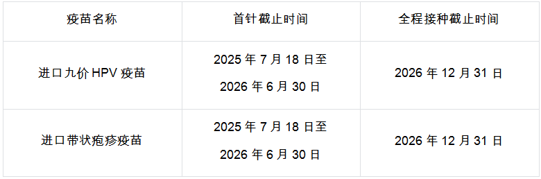 1.进口九价HPV疫苗、进口带状疱疹疫苗需在2025年7月18日至2026年6月30日完成首针接种,并在2026年12月31日前完成全程接种,否则不享受活动优惠。